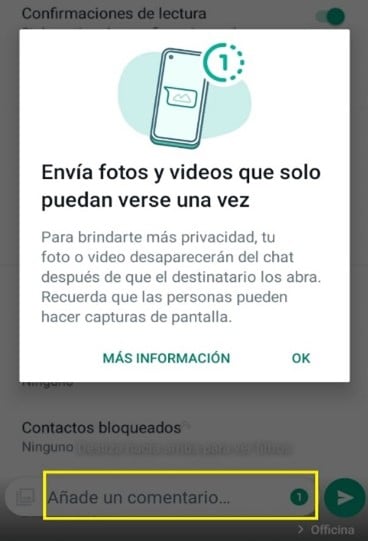 Con esta opción, al enviar mensajes de fotos o videos se tiene la posibilidad de que la persona que los reciba los vea una sola vez, con esto se asegura que estos mensajes solo sean leídos, pero no almacenados en el dispositivo, otorgando mayor privacidad de datos para el usuario. Esto se activa al momento de enviar el mensaje, a través del icono verde de la caja de mensajes, así como se muestra en la imagen.