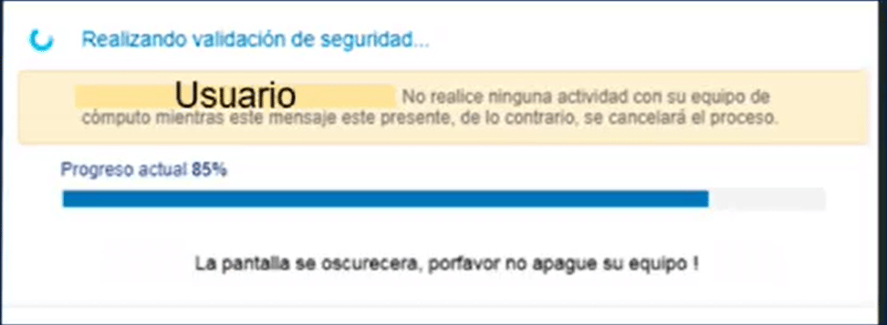 En pantalla del usuario, aparentemente se esta actualizando el equipo y piden que aunque la pantalla se oscurezca la pantalla no apaguen el equipo. Pareciera todo normal, sin embargo, por detras el defraudador esta realizando movimiento ya que cuenta con acceso al equipo.