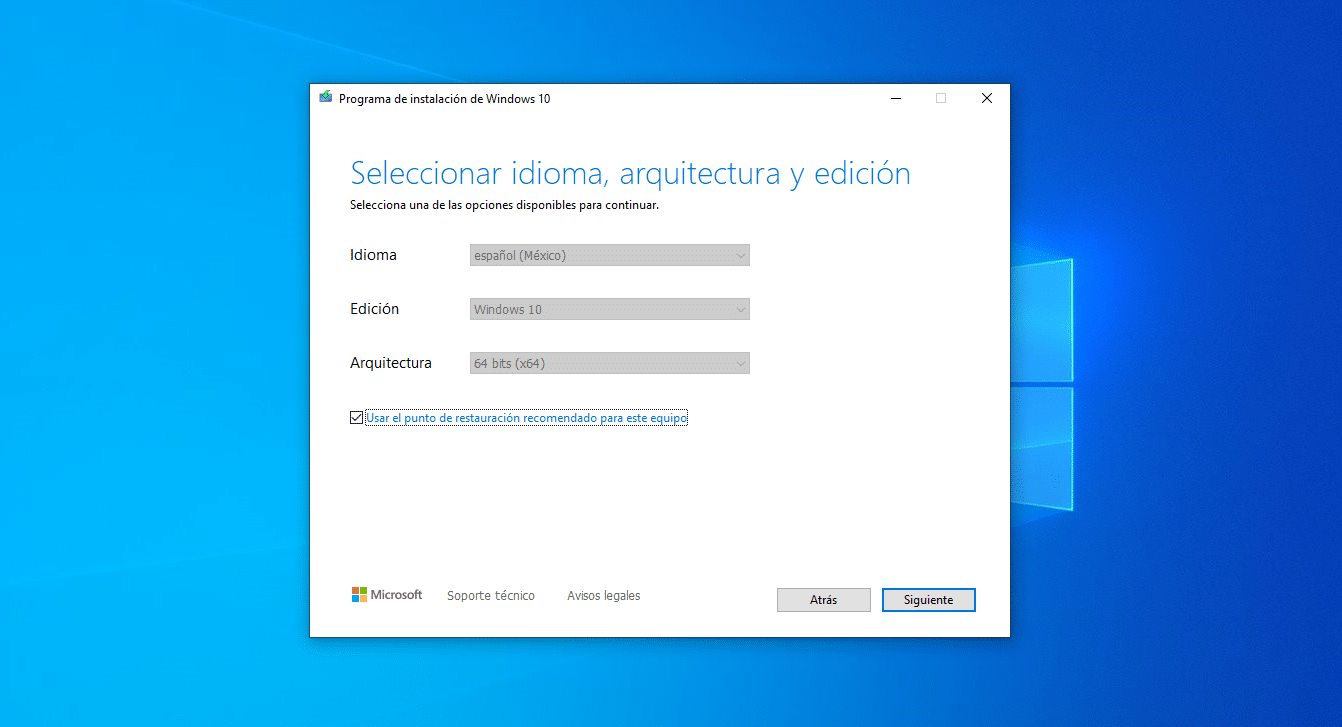 – Ahora debes seleccionar el idioma, edición y estructura que deseamos, por default tiene las opciones español, Windows 10 y 64 bits, pero si deseleccionar el cuadro de abajo, te deja elegir manualmente el idioma y la estructura.