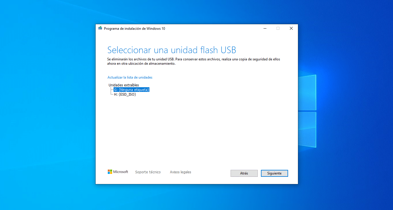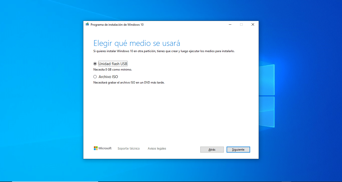 – Deberás seleccionar si quieres grabar en una USB o crear el archivo ISO para hacerlo más tarde, dejamos seleccionada la primera opción, conectamos nuestra USB (debe tener al menos 8GB de capacidad) y damos clic en siguiente.